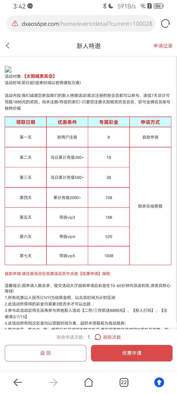 博彩论坛玩家 太阳城89912活动大厅自助申请送8彩金 到账情况:自测【充值后果自负】 领取方式:活动大厅自助申请送8彩金 安全系数:低 平台资历:未知 会员评分:★☆☆☆☆ 申领网址:https://146.103.80.6:5012/ 提现要求:最低提现额度为100元 图例介绍