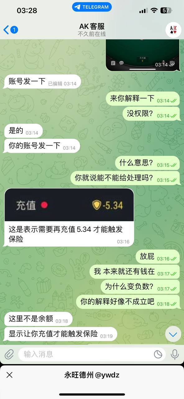 在 3月31日凌晨3点左右,我当时还在正常游戏中打牌,期间点开余额时,突然发现账户金额变成了负数,完全不合理。随后我第一时间联系所谓的客服经理“梦梦”,对方一直回避关键问题,不正面解释。